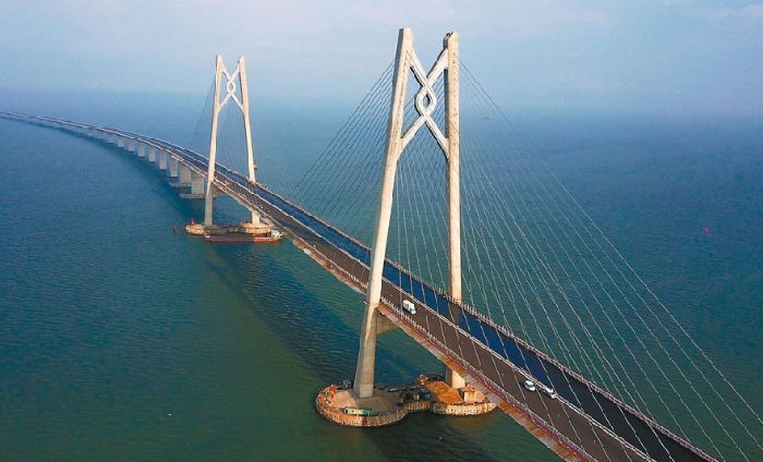 港珠澳大橋:連接香港、珠海、澳門的超大型跨海通道,全長55公里,是世界最長的跨海大橋,港珠澳大橋沉管隧道是全球最長的公路沉管隧道和全球唯一的深埋沉管隧道。